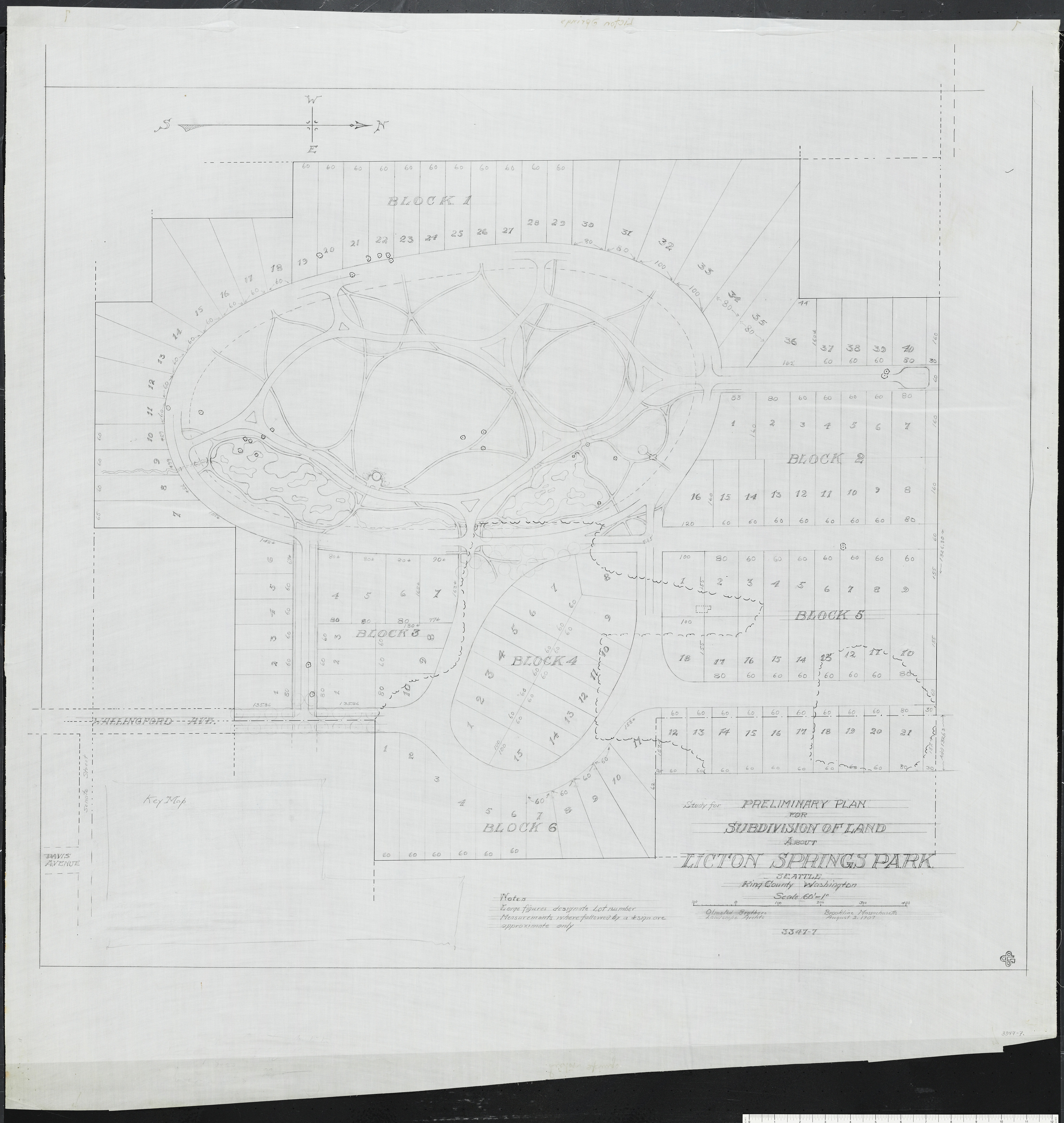 STUDY FOR/ PRELIMINARY PLAN/ FOR SUBDIISION OF LAND/ ABOUT/ LICTON SPRINGS PARK/ SEATTLE, KINGS COUNTY, WA./
