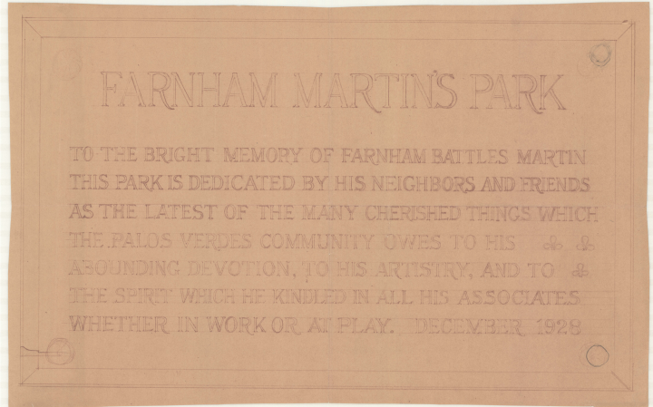 This plaque design commemorates Farnahm Martin who served as park superintendent for Palos Verdes Estates until his untimely death. He had been an employee of the Olmsted Brothers firm before becoming superindent. [05950-63]