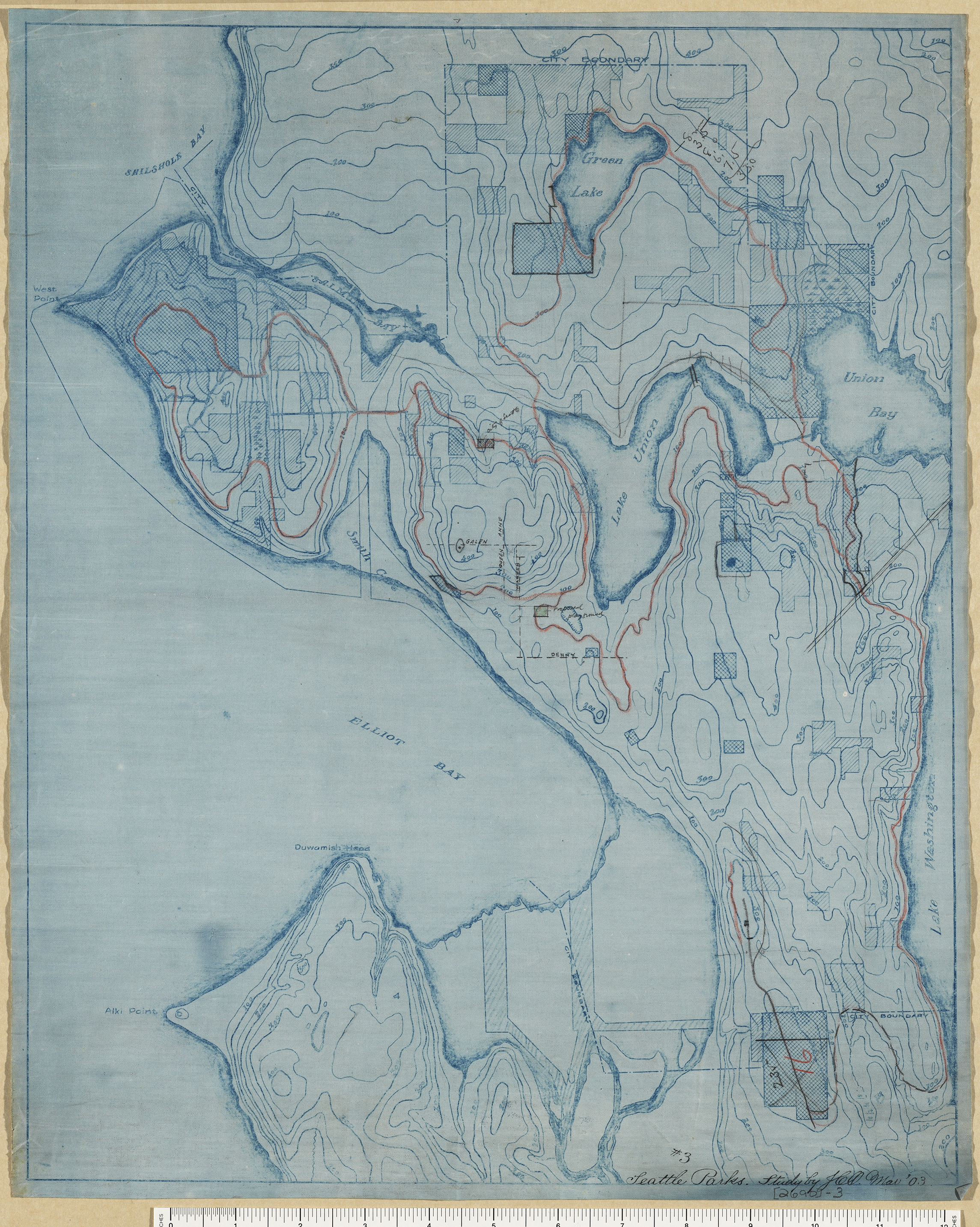 Contour map with red line given to J.C. Olmsted in March 1903 when he met with Captain Pratt in Washington, D.C. before coming to Seattle. It appears J.C. Olmsted made additional notes on the plan. [02690-3]