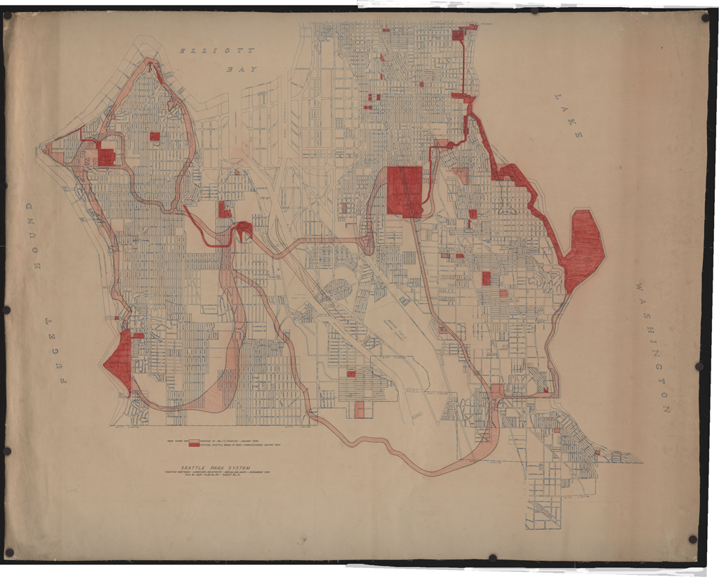 Seattle Park System / Proposed by Mr. J.C. Olmsted - January 1908 / Existing - Seattle Board of Park Commissioners Report 1922 / November 1929