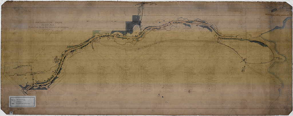 Print of 1906 plan with added color, showing roads and paths, water and drainage lines, and plant groupings with plant list. [02699-21_SMA (SMA 2491)]