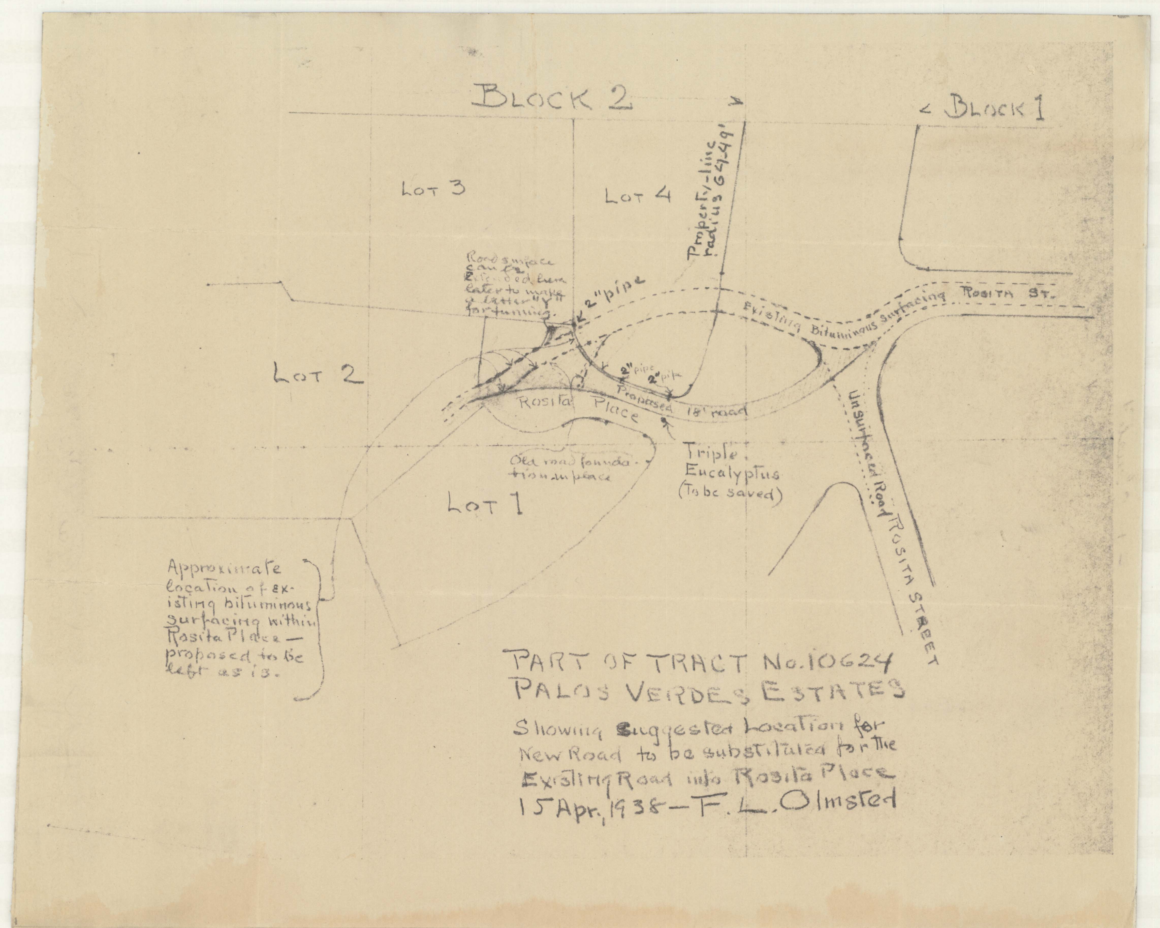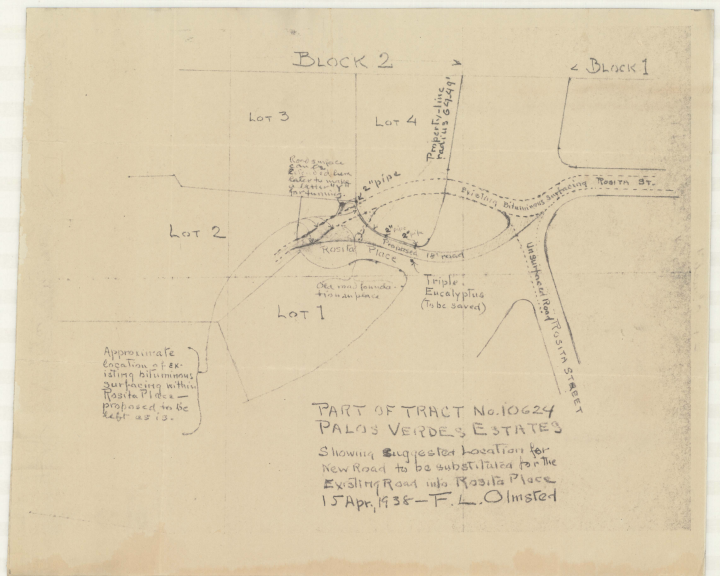 Sketch by F.L. Olmsted jr. showing suggested location for new road to be substituted for the existing road into Rosita Place, his residence in Palos Verdes. [08046-1007-pt1]
