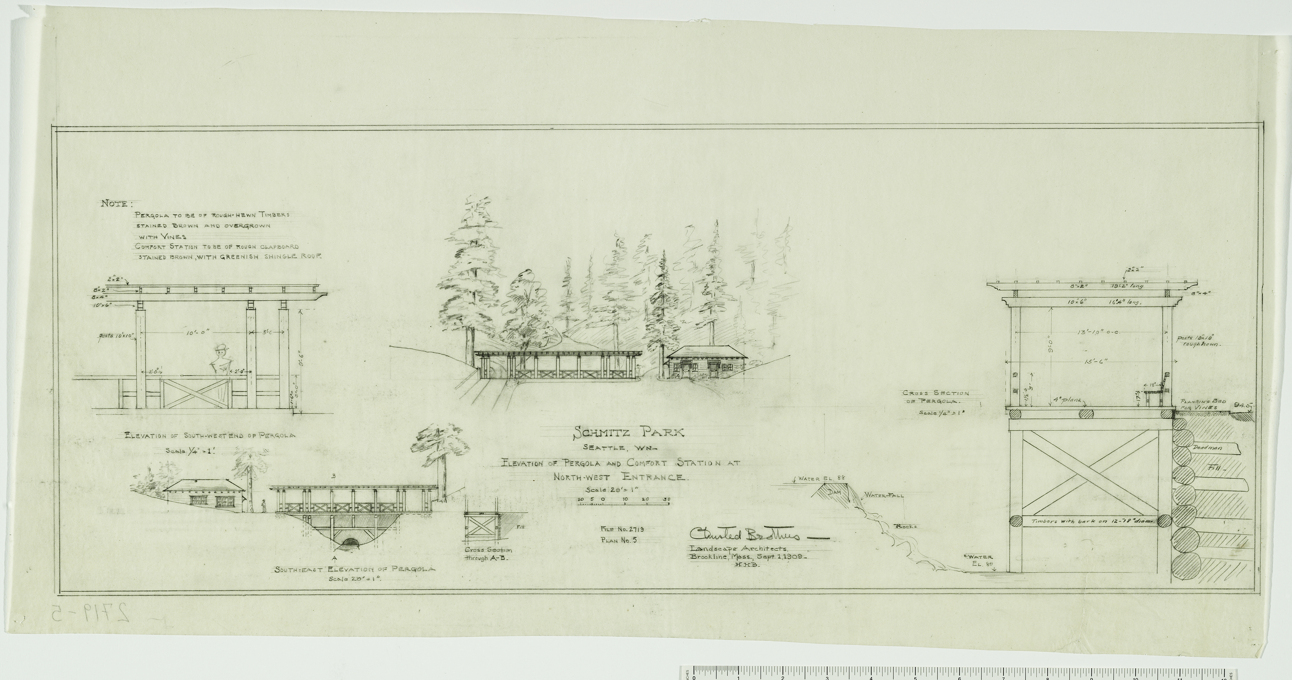 ELEVATION OF PERGOLA AND COMFORT STATION AT NORTH WEST ENTRANCE/
