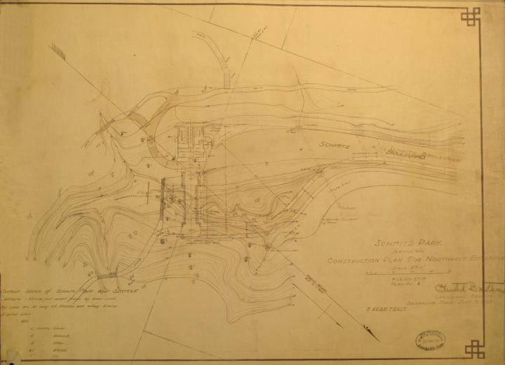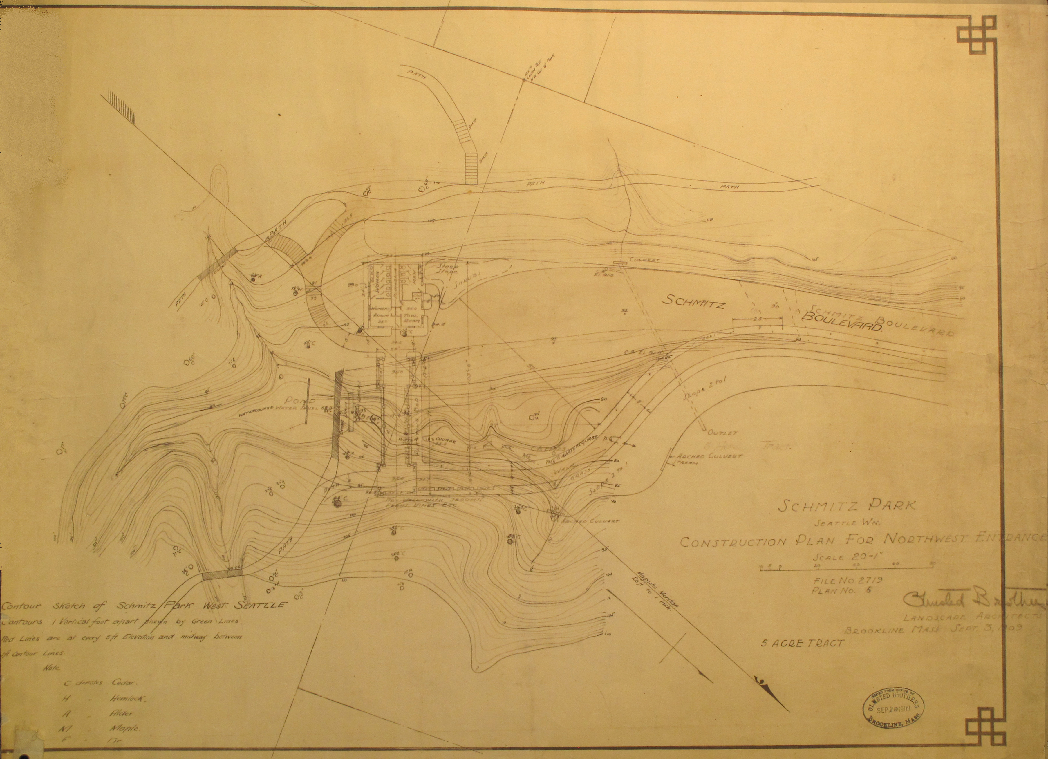 Construction Plan for Northwest Entrance overlaid on Contour Sketch for Schmitz Park. [02719-06_01_SMA (SMA 2321)]