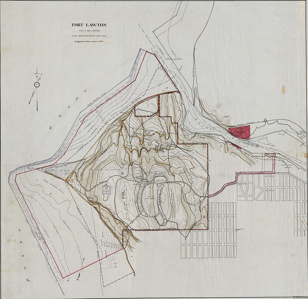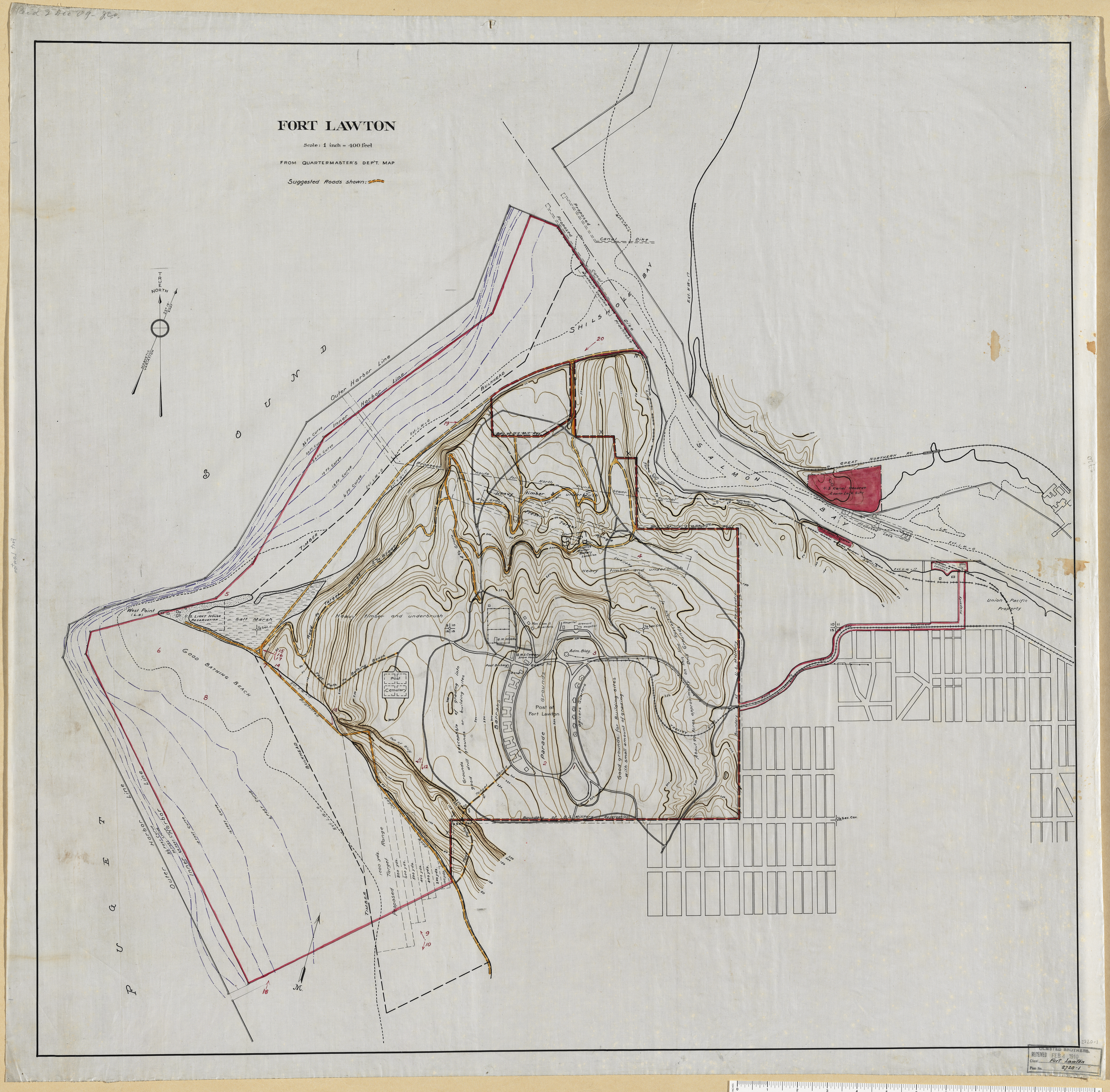 From Quartermaster Dept. Map, recto/ Rec'd 02-Dec-1909, J.C.O. recto/ Rec'd from J.C.O., Seattle, Wa. by mail, P/I/ ( Shows contours, elevations, roads, bldgs. & Harbor lines.)
