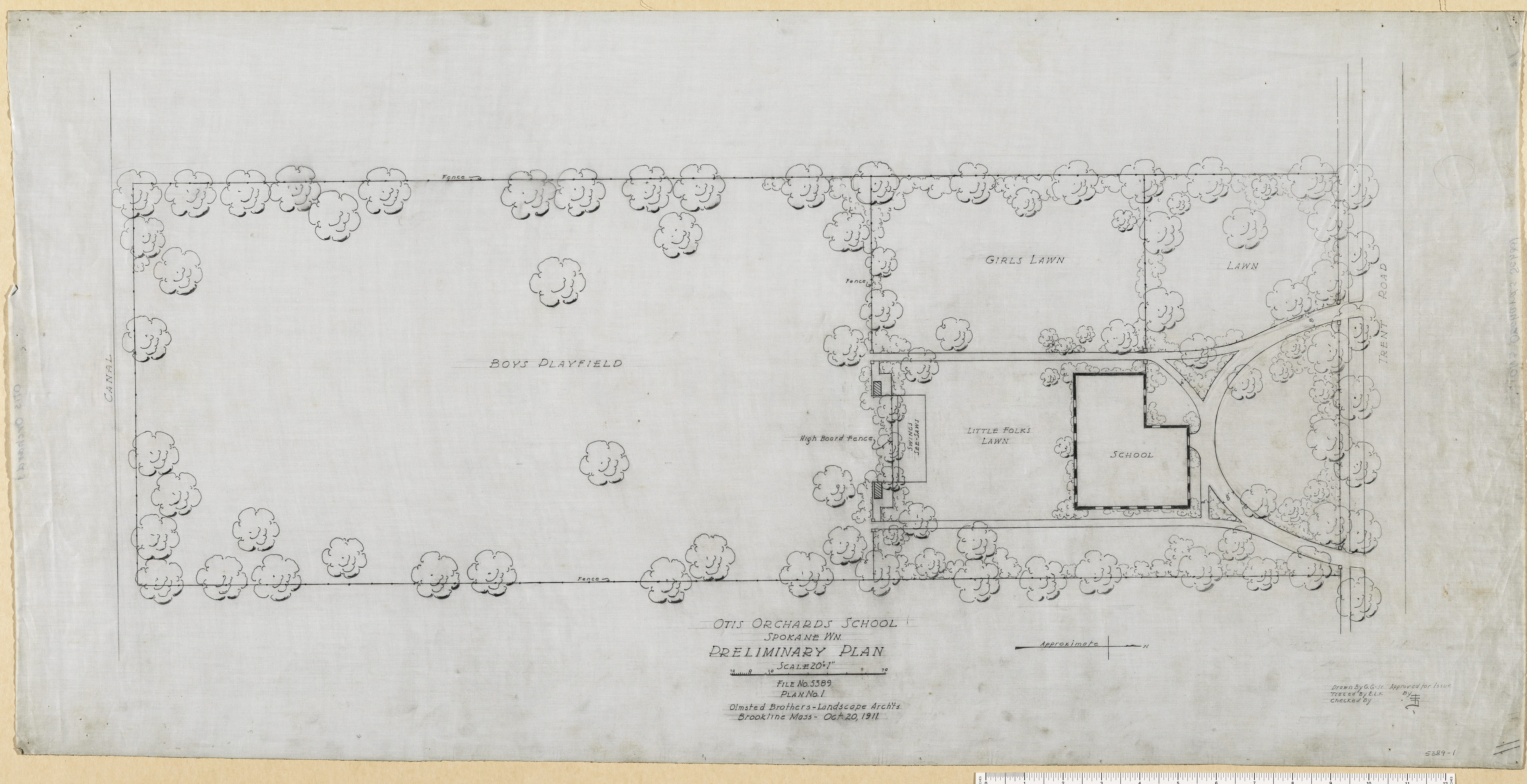 NOTE(S): CANAL; BOY'S PLAY FIELD; FENCE; HIGH BOARD FENCE; SWINGS, SEE-SAWS; LITTLE FOLKS LAWN; GIRL'S LAWN; SCHOOL; LAWN; 4'; 8'; FRONT ROAD. PROVENANCE: OB/LA; DRAWN BY G. G. JR.; TRACED BY E. L. K.; APPROVED FOR ISSUE [PICTOGRAM USED]; AND "DEWAR & DORR" [PI]. DATE INFO: 20-OCT-1911.