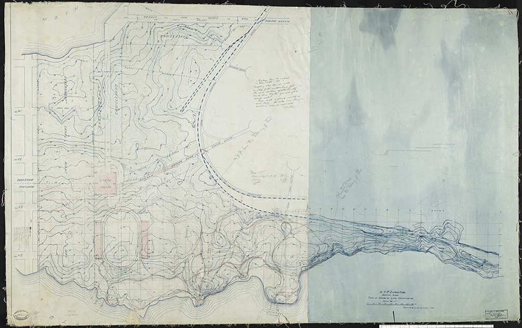Alaska, Yukon, Pacific Exposition/ Seattle, WA./ Topo of Shore of Lake Washington [orig]/ Trails on Shore of Lake[v]/