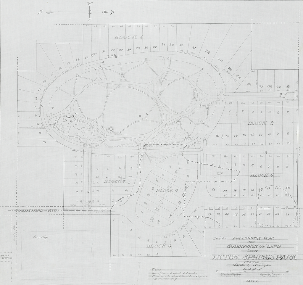 STUDY FOR/ PRELIMINARY PLAN/ FOR SUBDIISION OF LAND/ ABOUT/ LICTON SPRINGS PARK/ SEATTLE, KINGS COUNTY, WA./