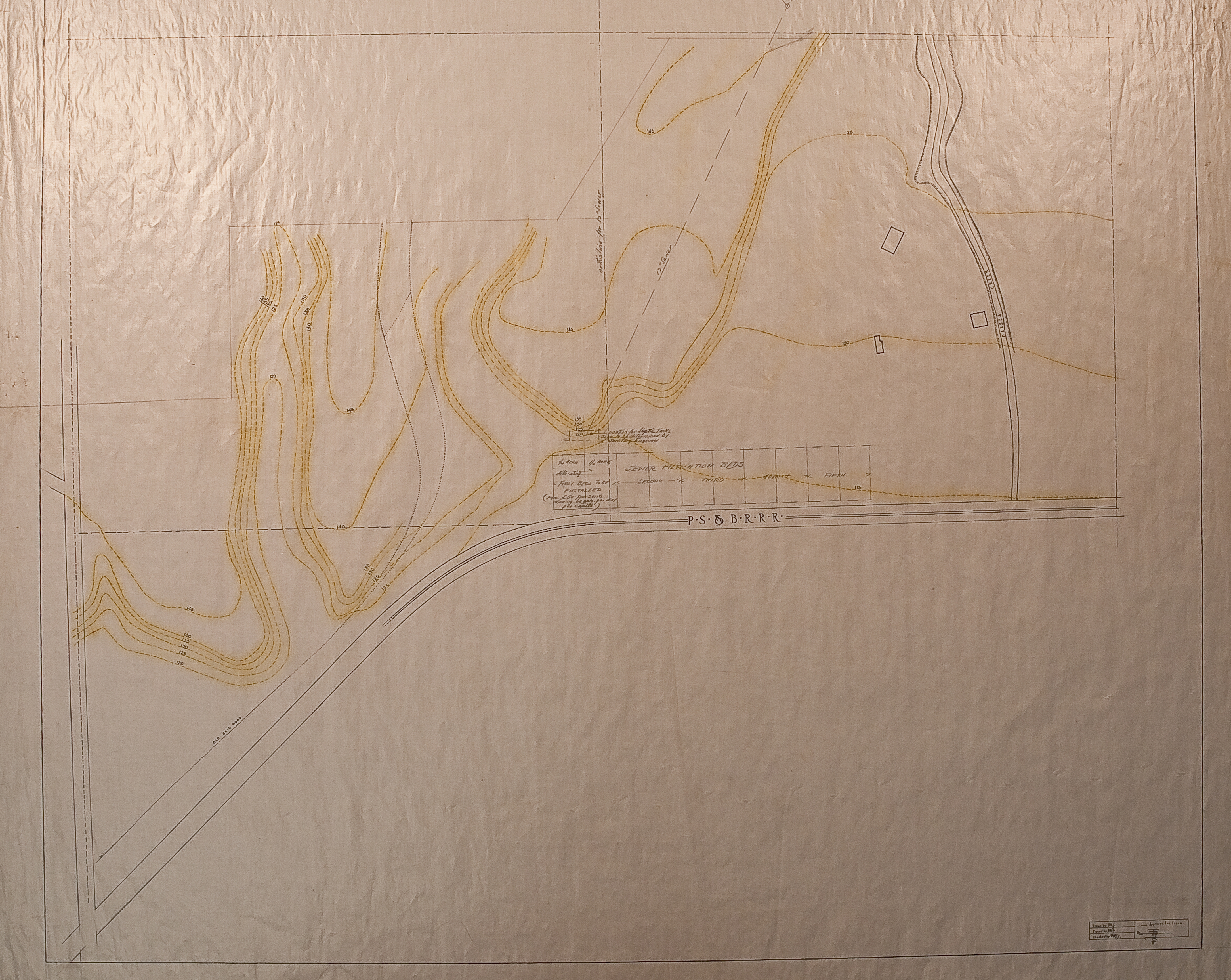 NOTE(S): COPY OF [PLAN?] #15; SEE #22 FOR CROSS SECTION [PI]; [INCLUDES NOTES RELATING TO SEWER SYSTEM]; [SHOWS LAND BORDERED BY P. S. & B. R. RAILROAD]. PROVENANCE: OB/LA; DR. BY P. R. J.; TR. BY B. A. F.; APPROVED FOR ISSUE BY J. F. D; AND "JEFFERS [PI]." DATE INFO: 09-NOV-1911 [PI].