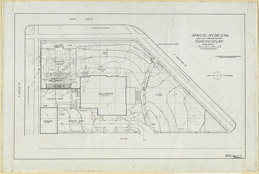 OBLA, recto/ 38th Ave. N., Rose Garden, Bird Bath, Arbor, Laundray Yard, Residence, Garage, Service Yard, E. Madison St. recto/ ( Includes contours, elevations, top soil depth, & notes)/ Planting notes added to garden. recto/