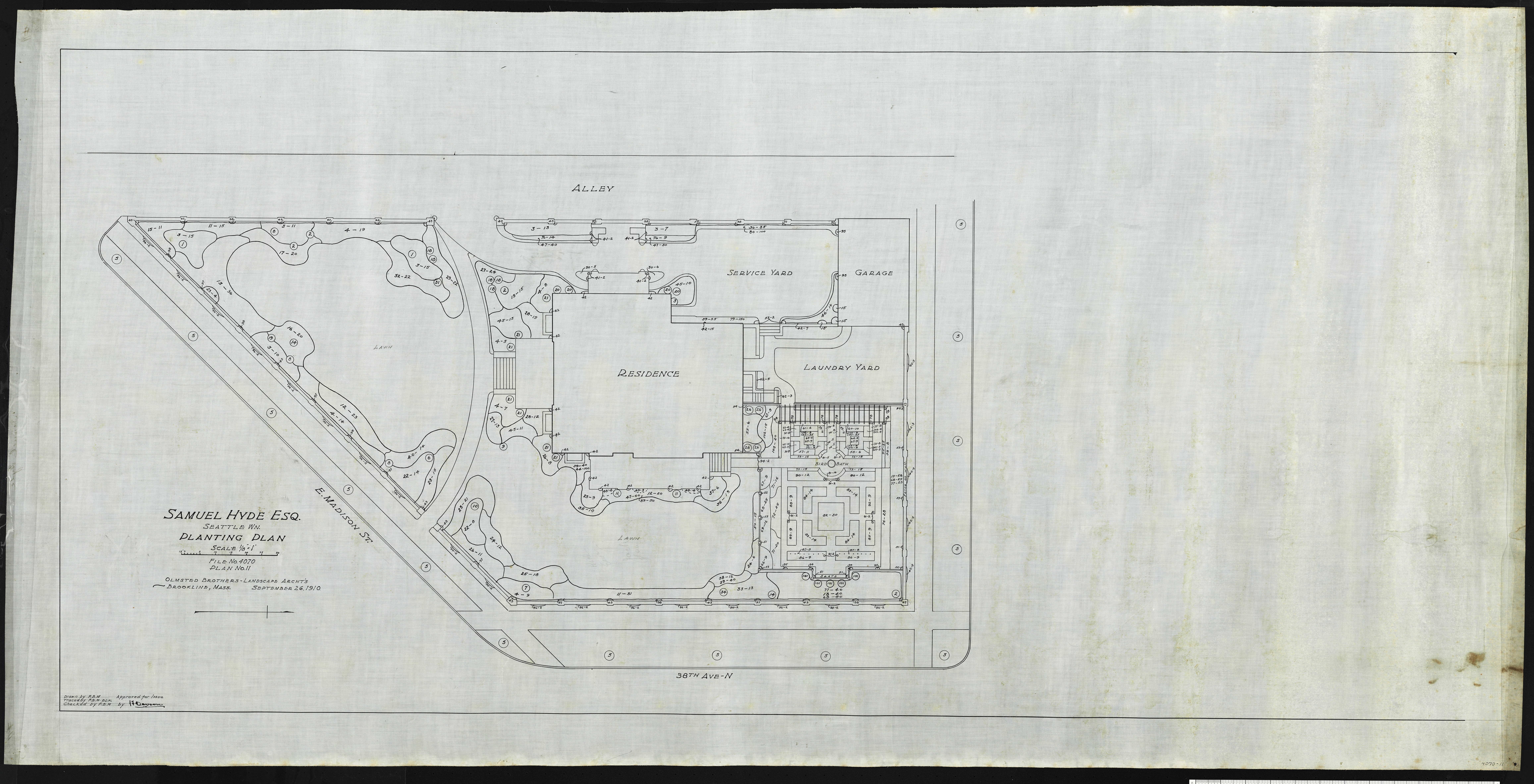 OBLA, recto/ (Indicates East Madison St., alley, lawn, service yard, garage, laundary yard, residence, & 38th Ave, N.)/ Planting Numbers, No Planting List, recto
