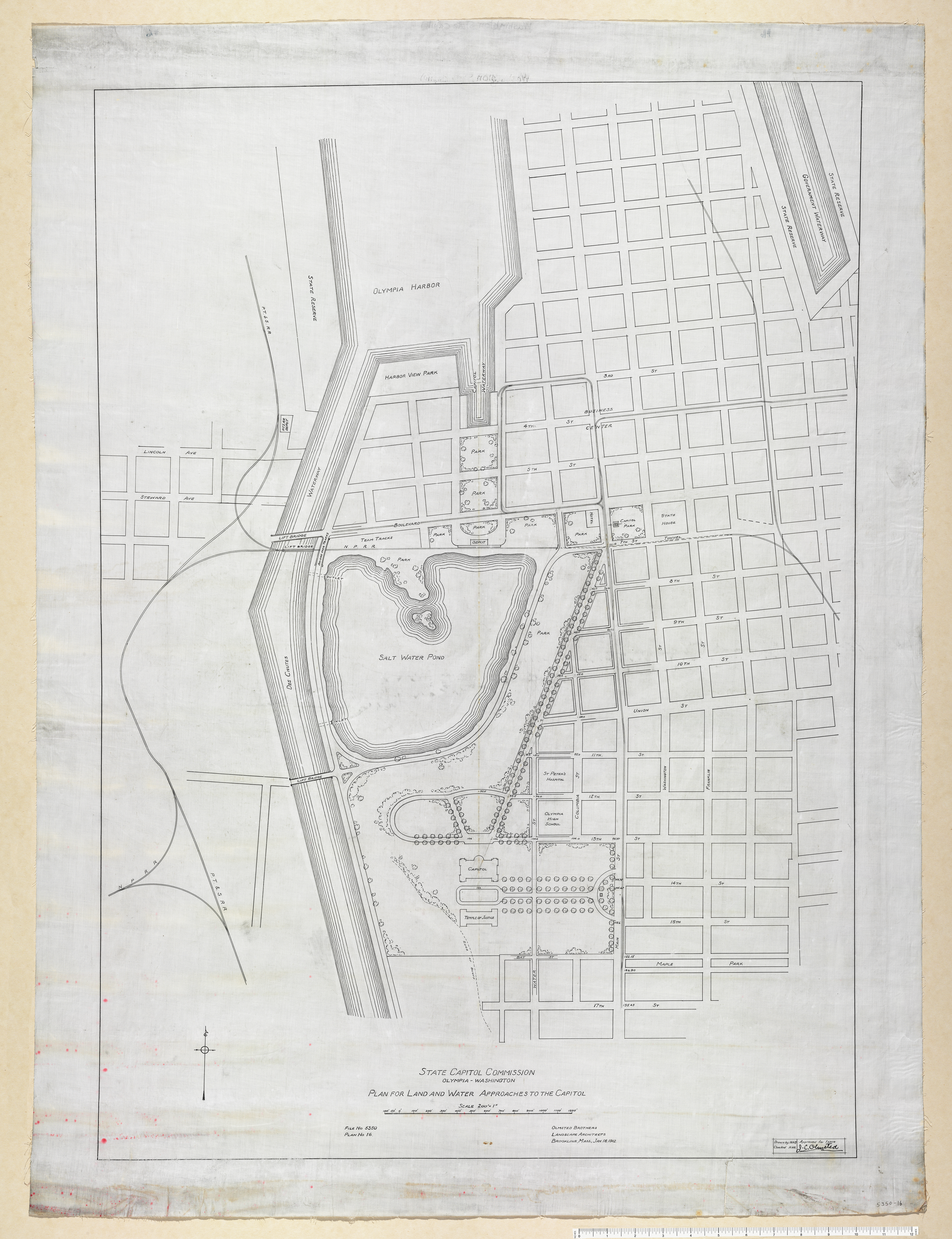 STATE CAPITOL COMMISSION, [STATE CAPITOL GROUNDS], OLYMPIA, WA - PLAN FOR LAND & WATER APPROACHES TO THE CAPITOL; PRELIMINARY PLAN FOR SECTION OF CITY ADJOINING CAPITOL GROUNDS [PI]