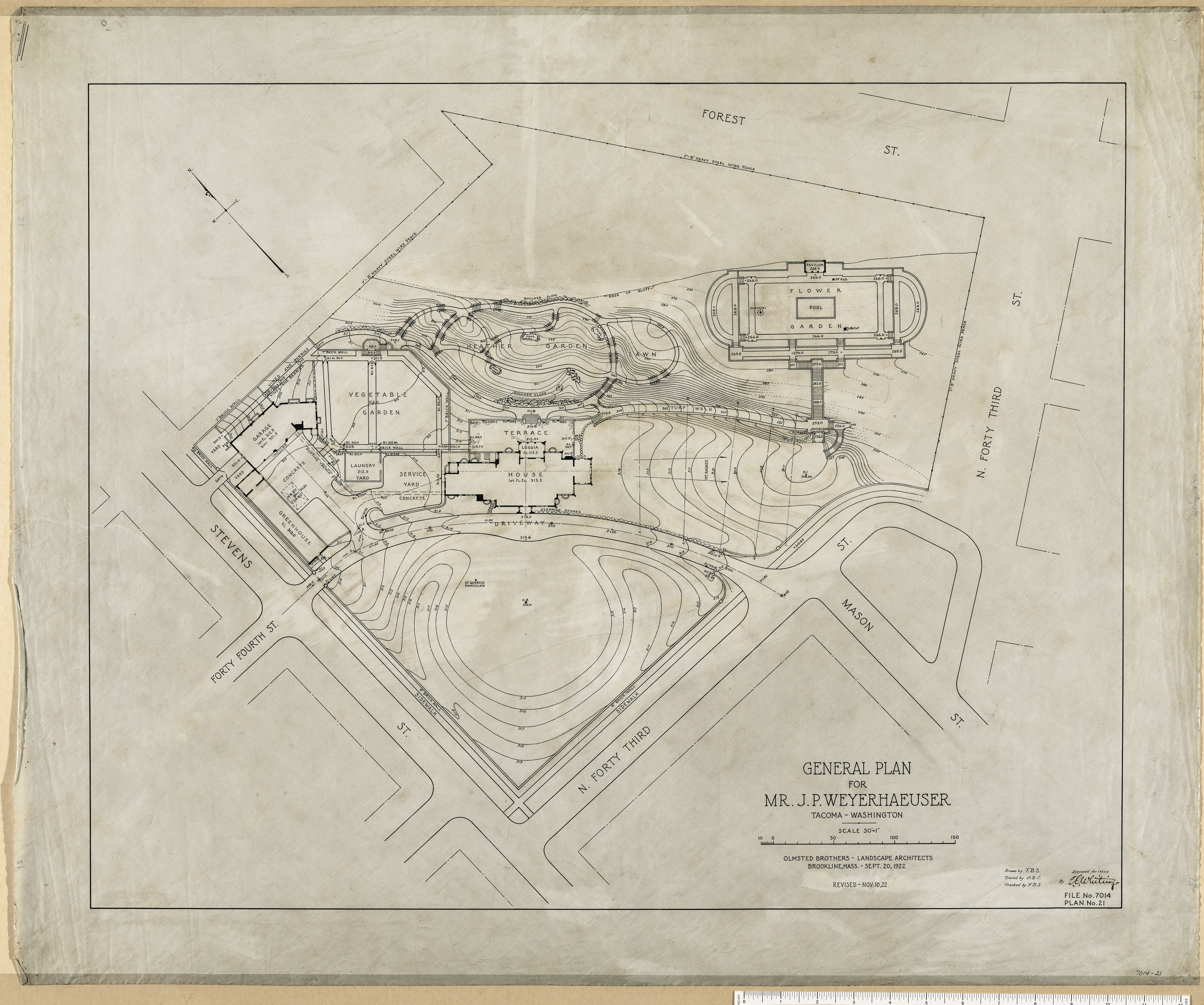 Revised 10-NOV-1922 [r]/ House, Terrace, Service Yard, Laundry Yard, Garage, Green House, Vegetable Garden, Heather Garden, Flower Garden, Section [r]