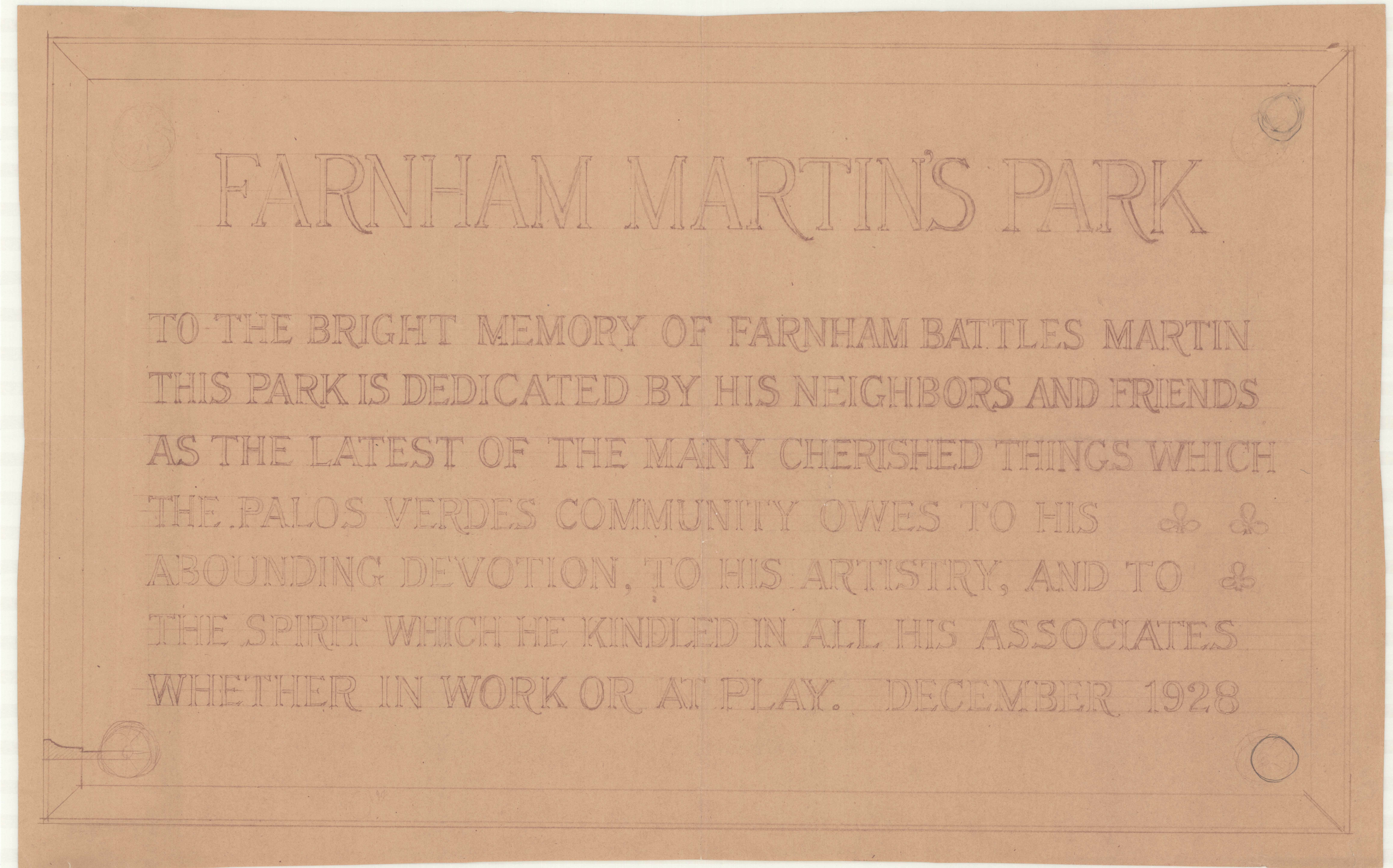 This plaque design commemorates Farnahm Martin who served as park superintendent for Palos Verdes Estates until his untimely death. He had been an employee of the Olmsted Brothers firm before becoming superindent. [05950-63]