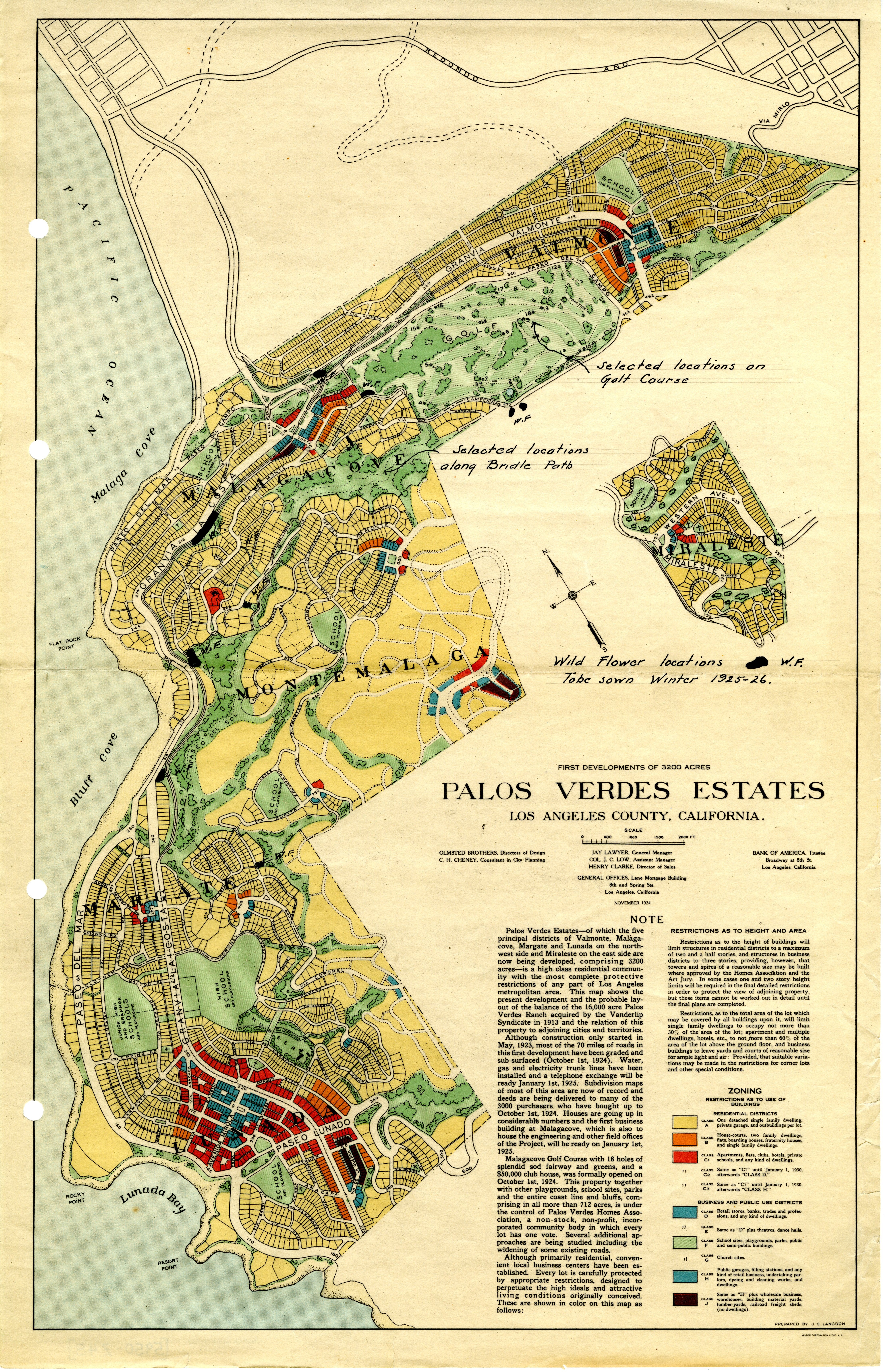 This small print of the November 1924 First Developments of the 3200-acres Palos Verdes Estates has a note about sowing wildflowers during the winter of 1925-26. [05950-z45]