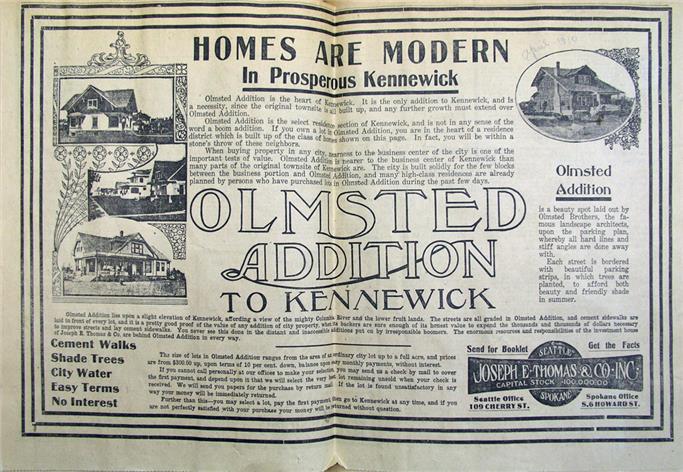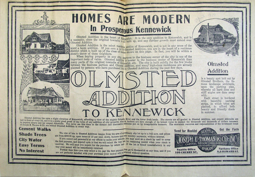 This clipping of a promotional advertisement for the Olmsted Addition in Kennewick is from the Alaska-Yukon-Pacific Exposition scrapbook (1909-1911), Series F, Olmsted Associates Records at the Manuscript Division, Library of Congress.