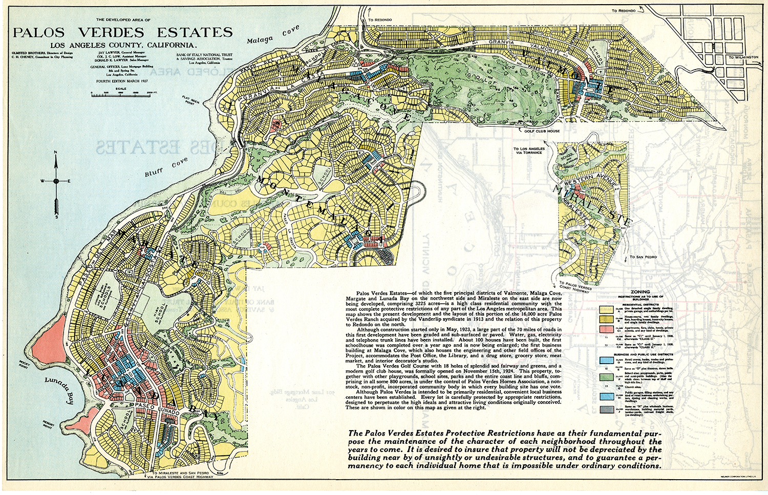 This lithograph of Palos Verdes Estates shows the zoning. Courtesy of the Frederick Law Olmsted National Historic Site and Palos Verdes Homes Association. [frlalith05950-05front]