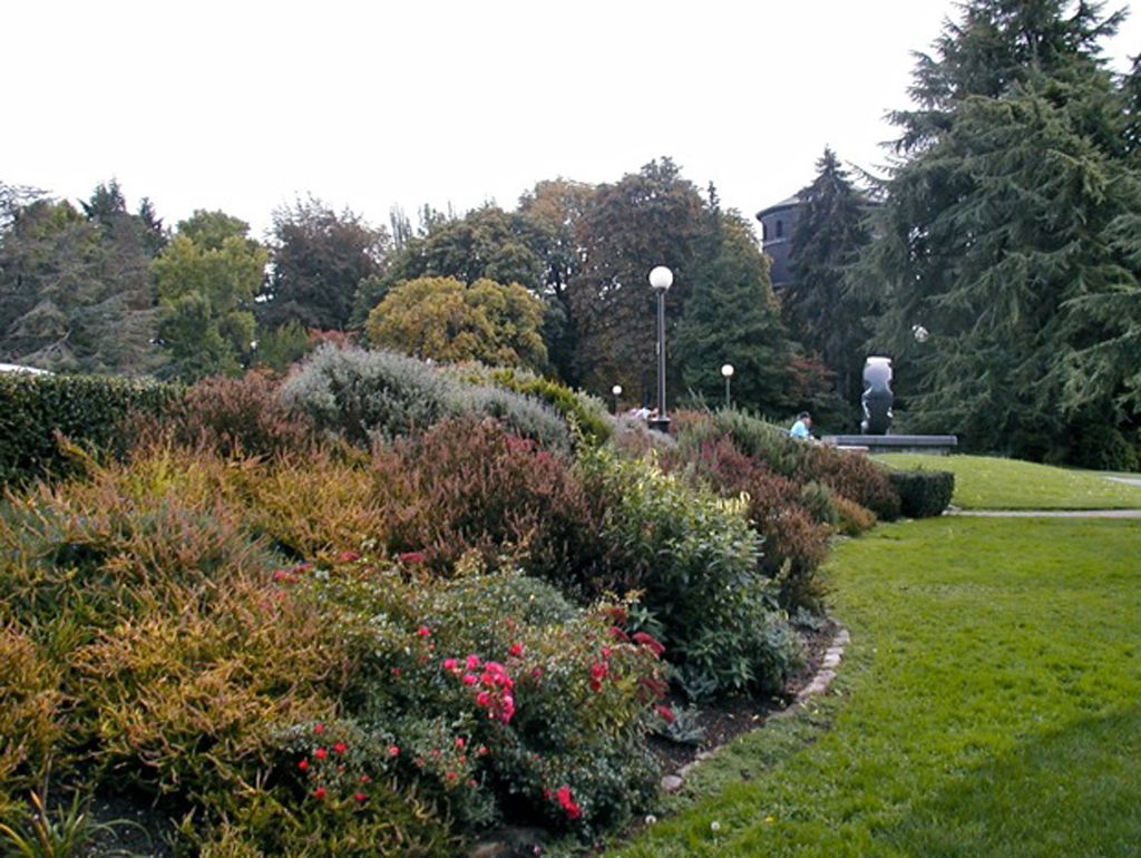 Volunteer Park slope plantings west of Concourse with Water Tower in the background. {Vegetation - Site Furnishing - Building}