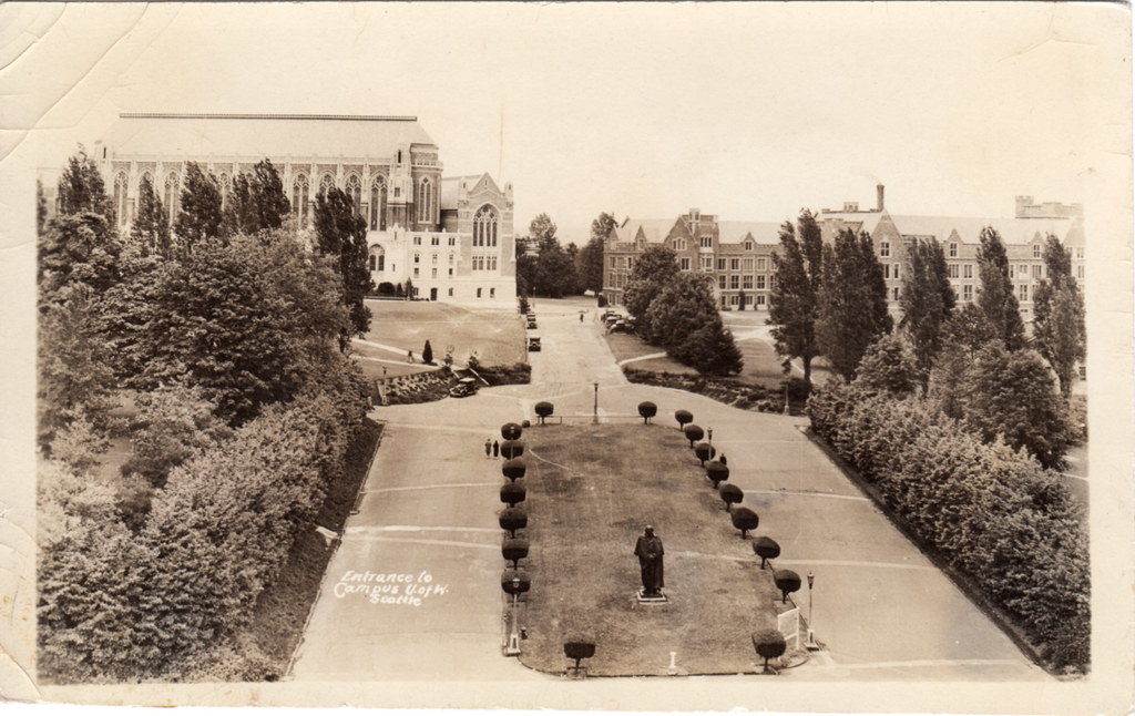 The main entrance to Alaska-Yukon-Pacific Exposition at 40th Street NE continued as the entrance to the growing University of Washington campus. The George Washington statue in the photo is now located at the pedestrian entrance from Campus Parkway. {Spatial Organization - Vegetation - Circulation - Site Furnishing}