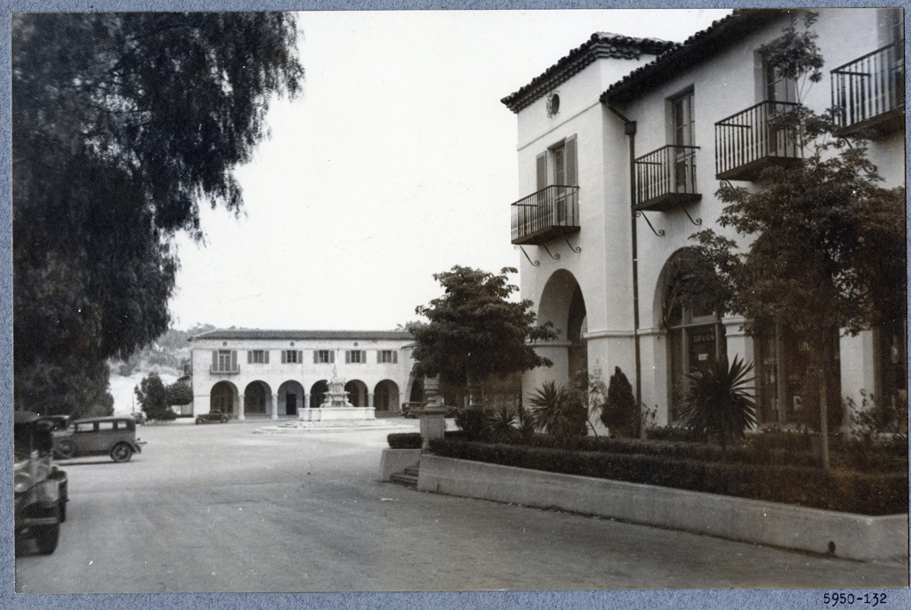 Malaga Cove Plaza from in front of Gardner Building, taken by F.L. Olmsted, Jr. in March 1935 (see 05950-24-ph005a). {Vegetation - Water Feature - Structure - Building} [photo album 05950-02-ph132]