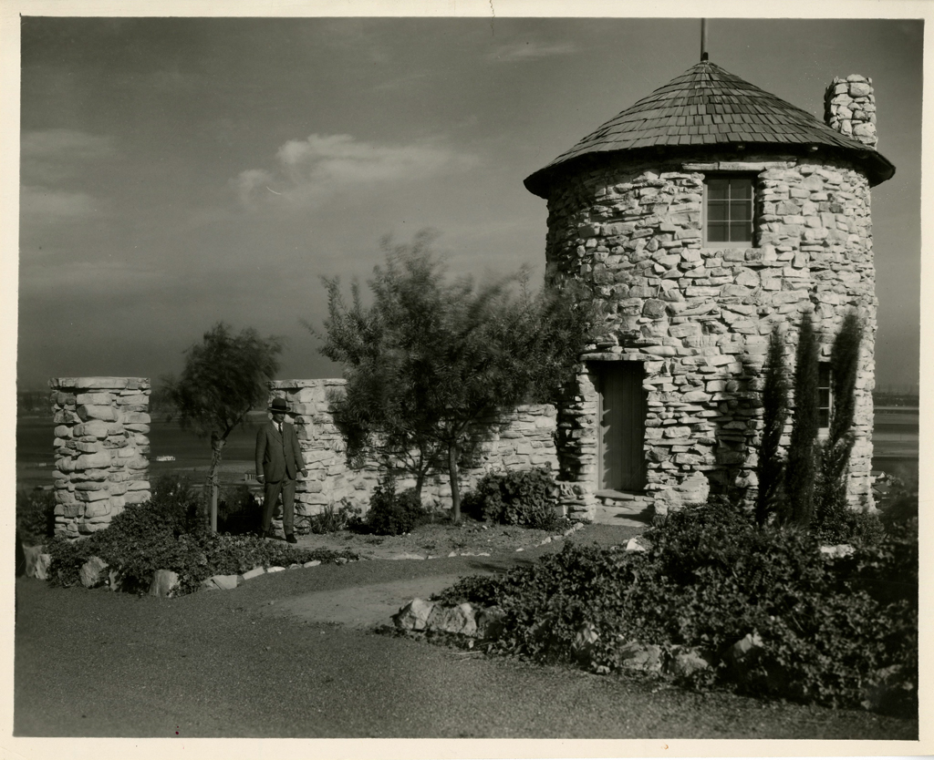 Built in 1926 on parkland the Mirlo Gate Lodge Tower was intended as a gated entrance. {Vegetation - Structure - Building} [photo album 05950-14-ph004a]