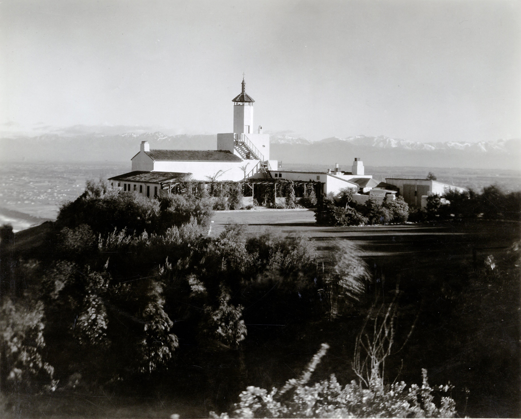 La Venta Inn with view of snow-capped San Gabriel Mountains beyond. {Topography - Vegetation - Building} [photo album 05950-26-ph004a]