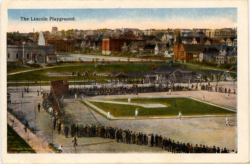 Lincoln Playground, now Cal Anderson Park, with shelterhouse and reservoir (original photo taken by Webster & Stevens). See plan 02691-12. {Spatail Organization - Structure - Site Furnishing - Building}