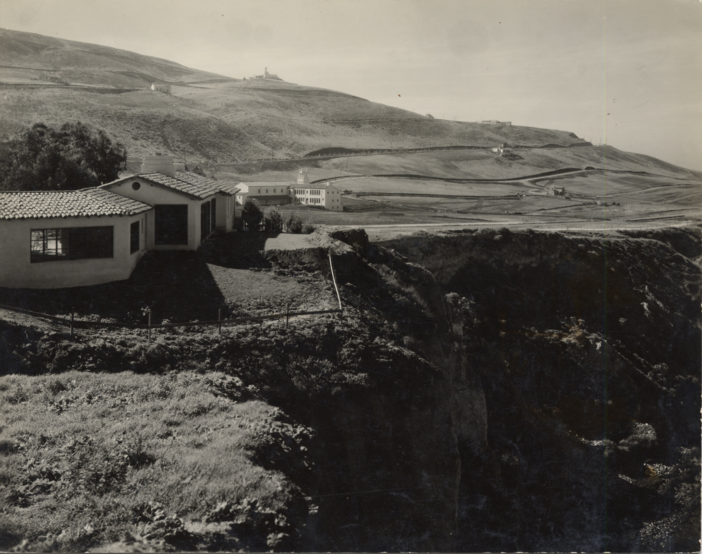 View of house on the bluffs with Malaga Cove School beyond and La Venta Inn in the distance. Courtesy of Palos Verdes Homes Association Photograph Collection. {Topography - Vegetation - Circulation - Building} [PVLD3825 (000016154)]