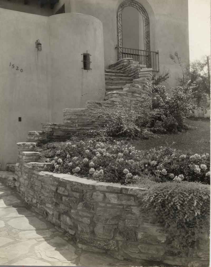 Stonework stairway with planting leading to entry of Schreiber house. Courtesy of Palos Verdes Homes Association Photograph Collection. {Vegetation - Circulation - Structure - Building} [PVLD:4365 (000021006)]