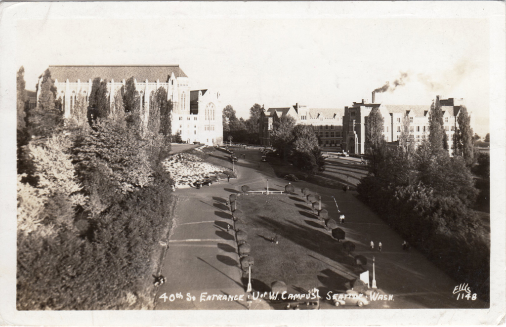 The 40th Street entrance tp the University of Washington Campus showing the remnants of the circulation from the Alaska-Yukon-Pacific Exposition designed by John Chalres Olmsted. {Spatial Organization - Circulation - Vegetation - Building}