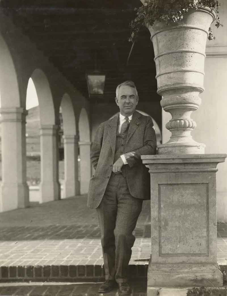James Frederick Dawson, at the Gardner Building in Malaga Cove Plaza. He served as Landscape Architect for the Olmsted Brothers firm from 1896 to 1940 and carried out much of the work at Palos Verdes beginning in 1914. Courtesy of Palos Verdes Homes Association Photograph Collection. {Building} [PVLD:3566 (000022988)]