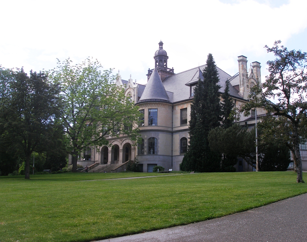 Denny Hall (1895) was the first building on the University of Washington campus and formed the core of the early university. {Vegetation - Building}