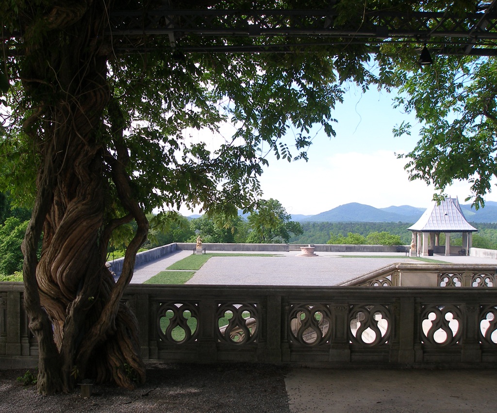 Biltmore view from trellis across terrace to Bue Ridge Mountains. {Spatial Organization - Vegetation - Strucutre}