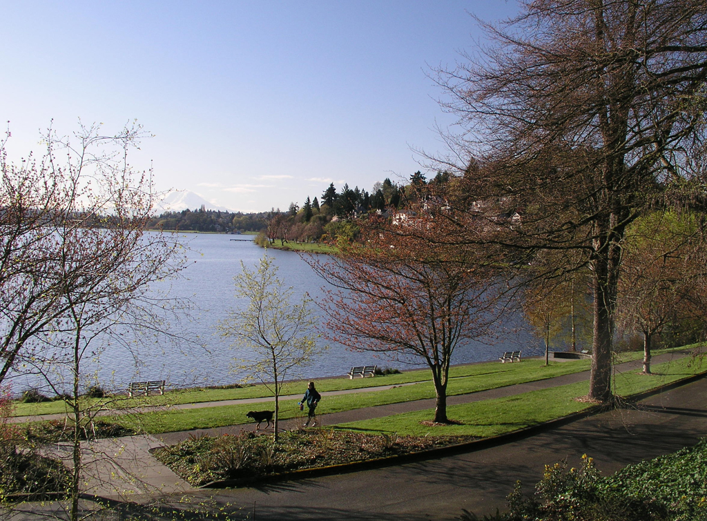 View from Colman Park from Lake Washington Boulevard. See historic postcard view. {Spatial Organization - View-Water - Vegetation - Circulation-Boulevard - Site Furnishing}