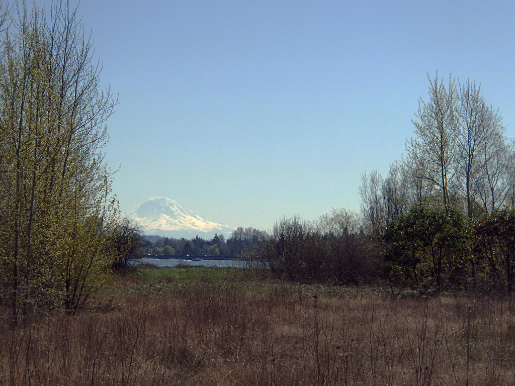 VIsta of Mt. Rainier across Union Bay. {Vista-water - Vegetation}