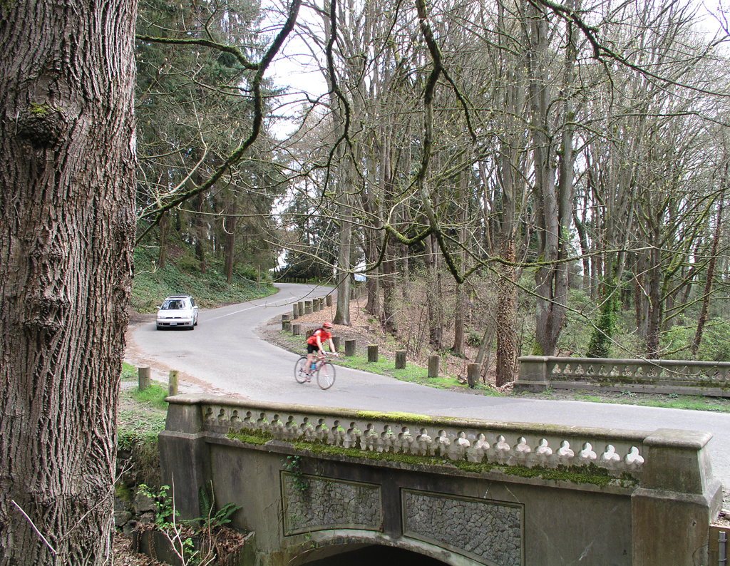 Lake Washington Boulevard crosses the ravine on a bridge similar in design to one in The Highlands. The railing is also reminiscent of a bridge in Prospect Park. {Vegetation - Circulation-Boulevard - Structure]