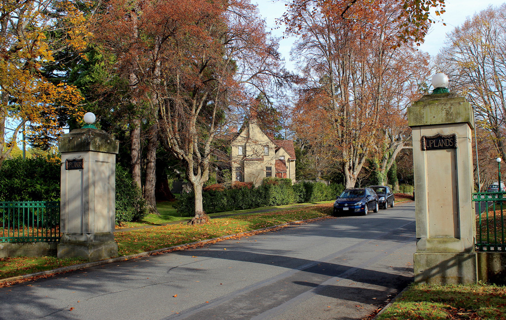 Gateposts at the southwest entrance to Uplands from Cadboro Bay Road. J.C. Olmsted did not favor the use of gateposts. {Vegetation - Circulation - Structure}