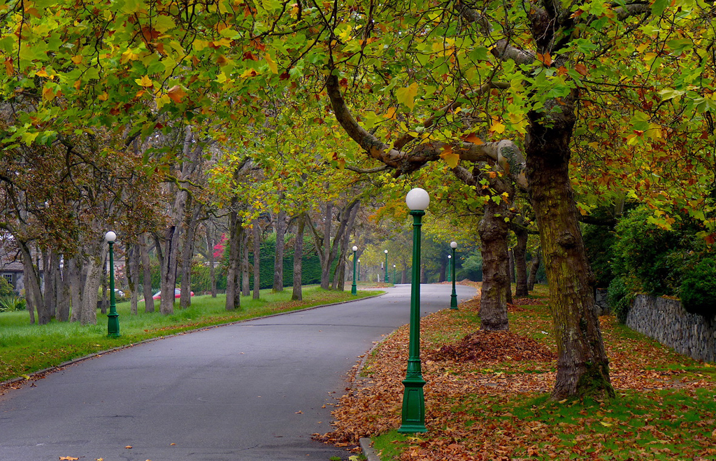 View south at the north entry to Midland Road. A triangle park is on the left between Beach Drive and Midland Road. {Vegetation - CIrculation - Site Furnishing}