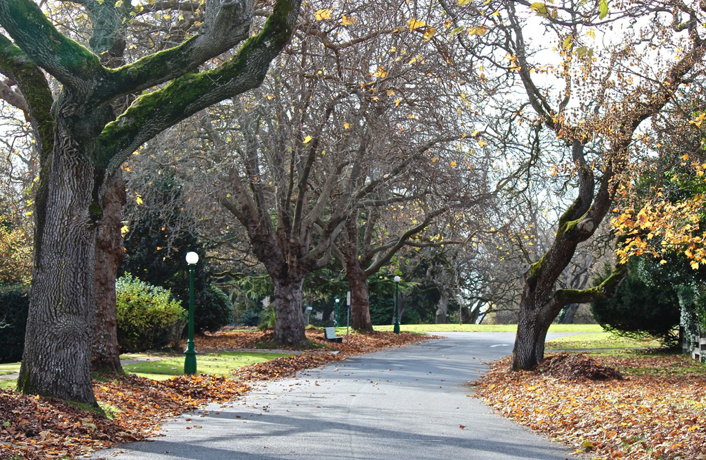 View south along Midland Road with Midland Circle in the distance. {Vegetation - CIrculation - Site Furnishing}
