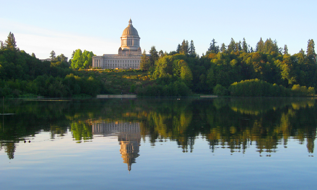 J.C. Olmsted was successful in his goal of keeping the forested setting for the Washington Sate Capitol. {Vista-Water - Vegetation - Building}