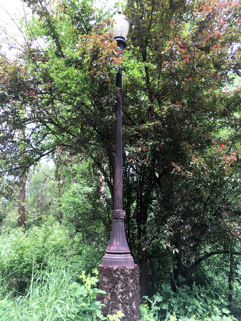 Historic lamp post on pedestal, likely to raise it above the flooding of Cozine Creek. (Vegetation - Site Furnishing)