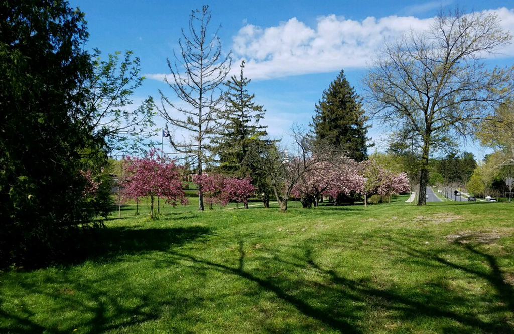 Although J.C. Olmsted's drawing notes in the job file show a less formal site plan, portions of the grounds of the high school have an Olmstedian character, as shown in this photograph along the north side of the campus with Handley Boulevard in the background on the right. (Vegetation - Boulevard)