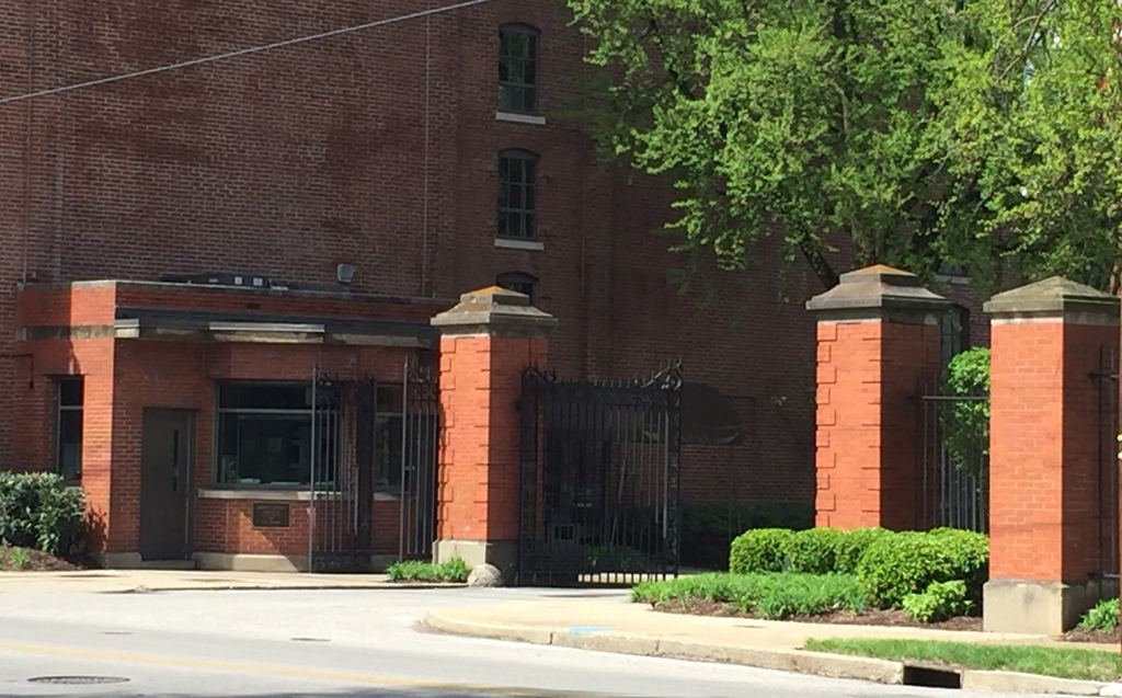 Plans and perspectives of this gate to the Brown-Forman distillery at the Howard Street Entrance can be found in the plan records of the Olmsted firm. (Vegetation - Circulation - Building)