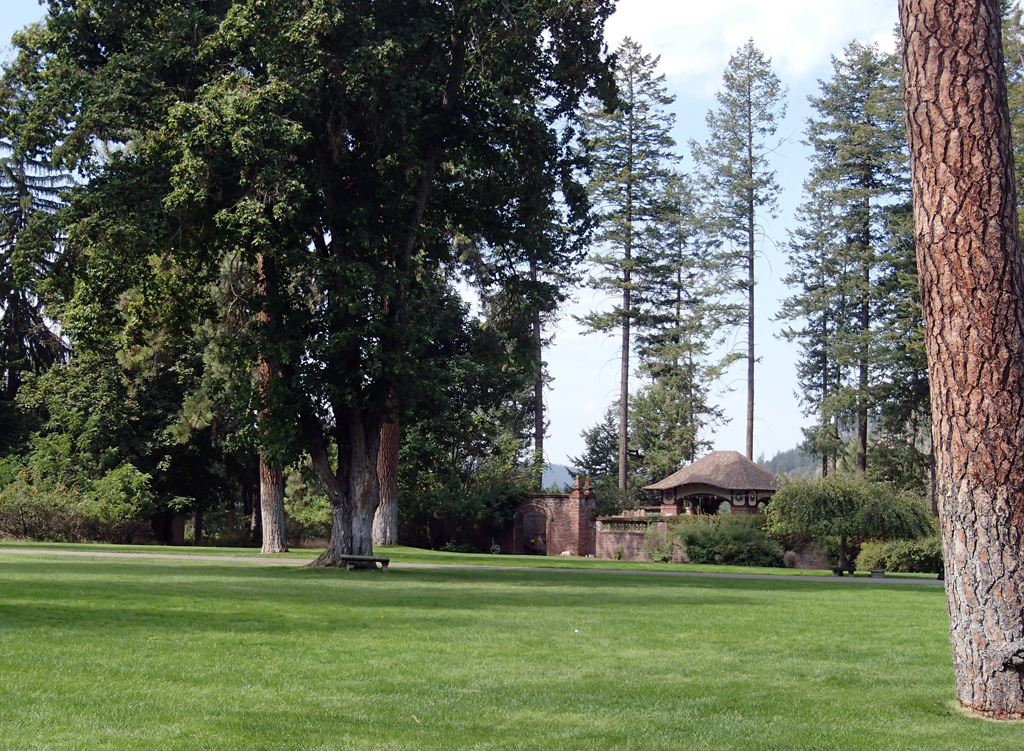 View across lawn toward walled garden of Jay P. Graves Ranch, named Waikiki. See plan 03879-33. {Vegetation - Structure}