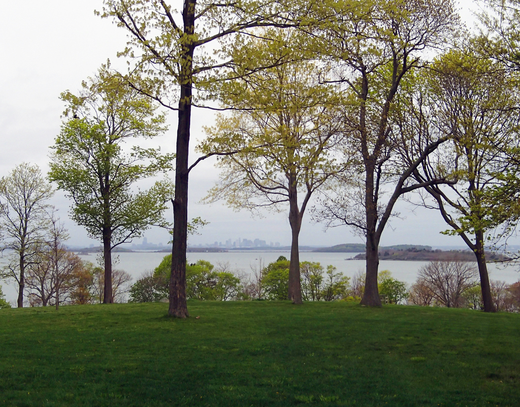 The vista from World's End toward downtown Boston across Hingham Bay. {Spatial Organization - Vista-Water - Vegetation)