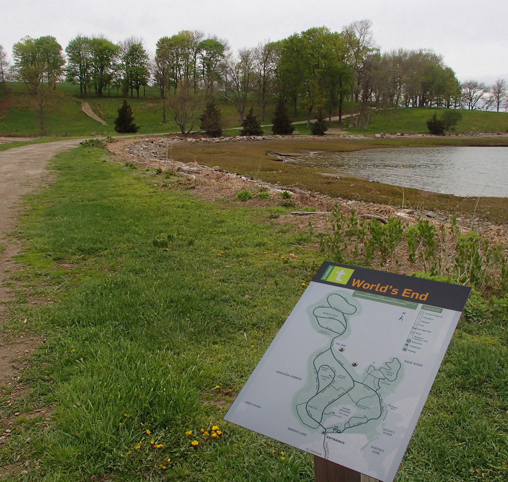 View of The Bar with one of the World's End signs. {Vista-water - Topography - Vegetation - Circulation)
