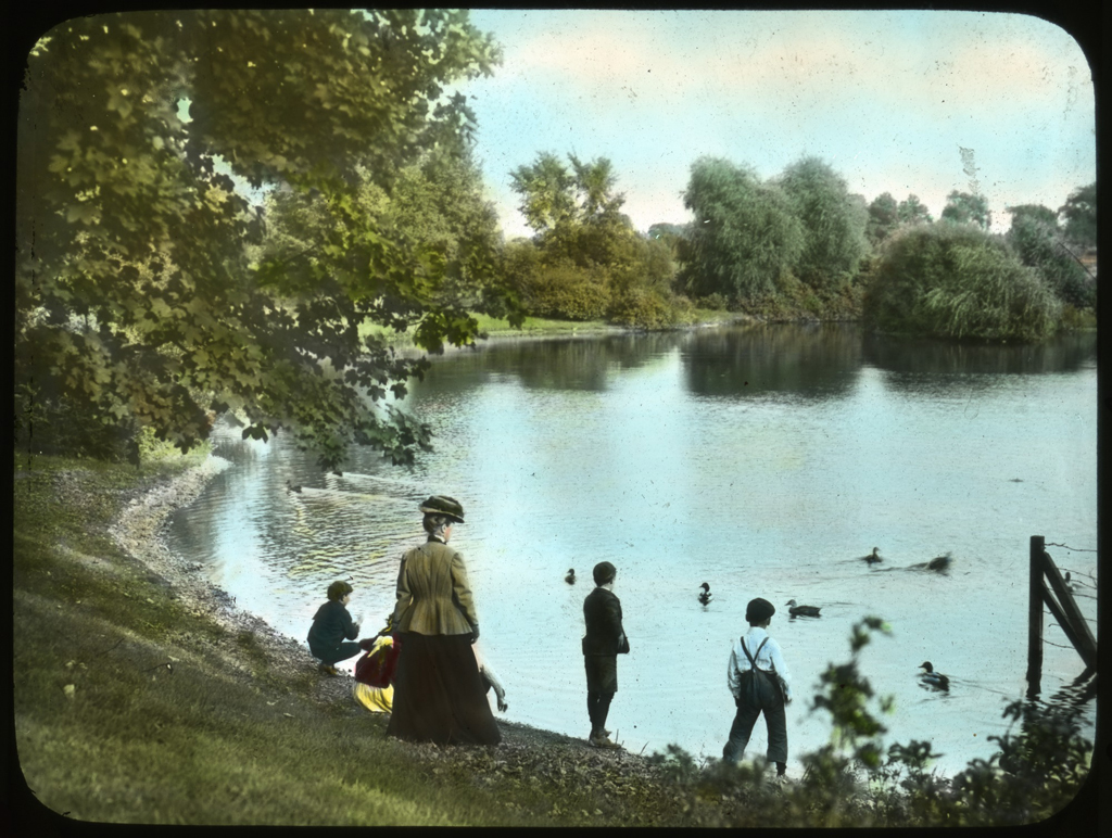 Hand-colored lantern slide showing a woman and children along the edge of Scarboro Pond. Courtesy of Smithsonian Institution, Archives of American Gardens, J. Horace McFarland Company collection. {Vegetation - Water Feature} [MA047005]