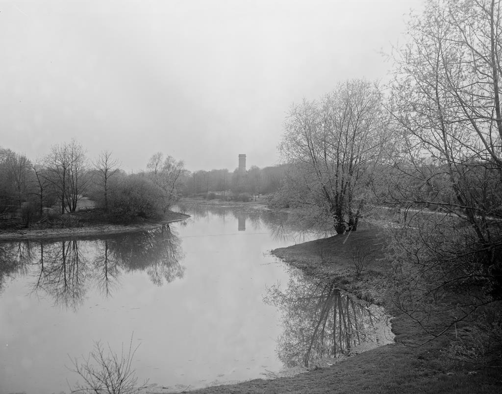 Black and white glass negative of the Muddy River with a distant view of Christ's Church, also known as Sears Memorial Chapel, in the background. Courtesy of Smithsonian Institution, Archives of American Gardens, Thomas Warren Sears Photograph collection. {Building - Water Feature} [MA132007]