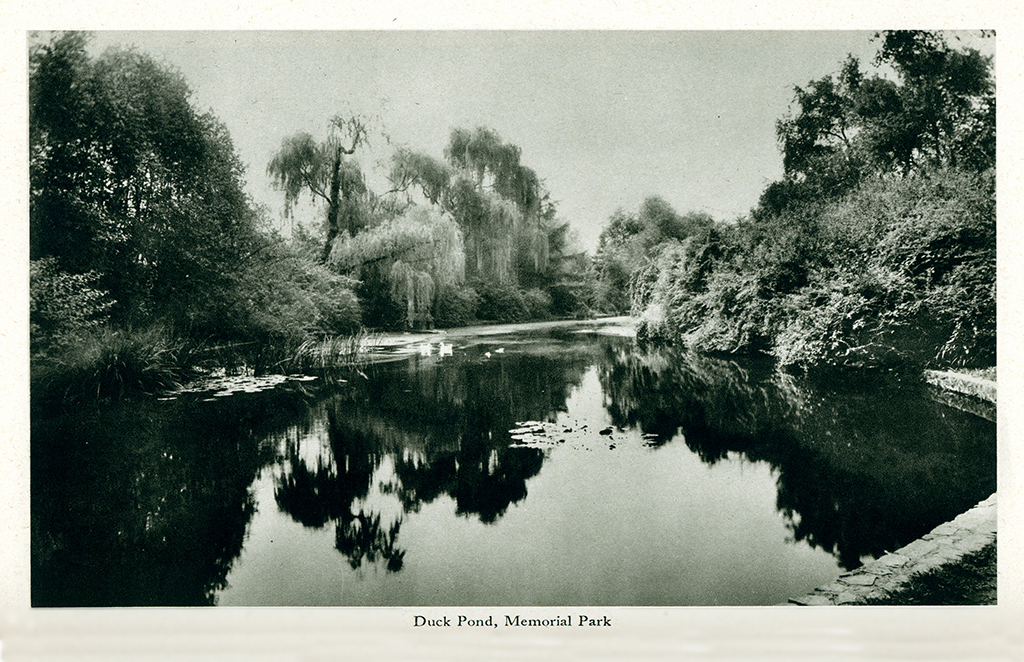 Black and white historic view of Duck Pond. {Vegetation - Water Feature - Structure}