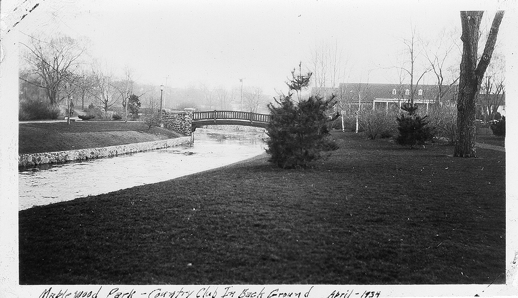 Maplewood Park looking south toward Maplewood Country Club {Vegetation - Water Feature - Structure - Building}